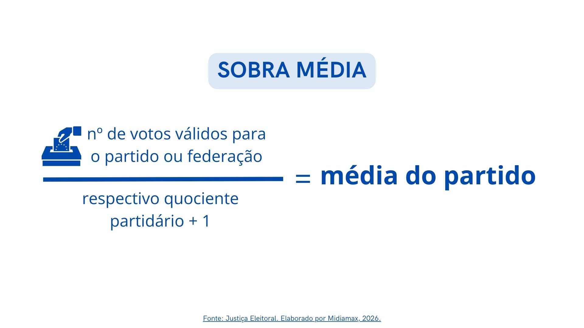 O cálculo da média de cada partido para repescagem da sobra eleitoral é feito a partir da divisão da quantidade de votos válidos que a legenda recebeu para determinado cargo pelo quociente partidário mais um.