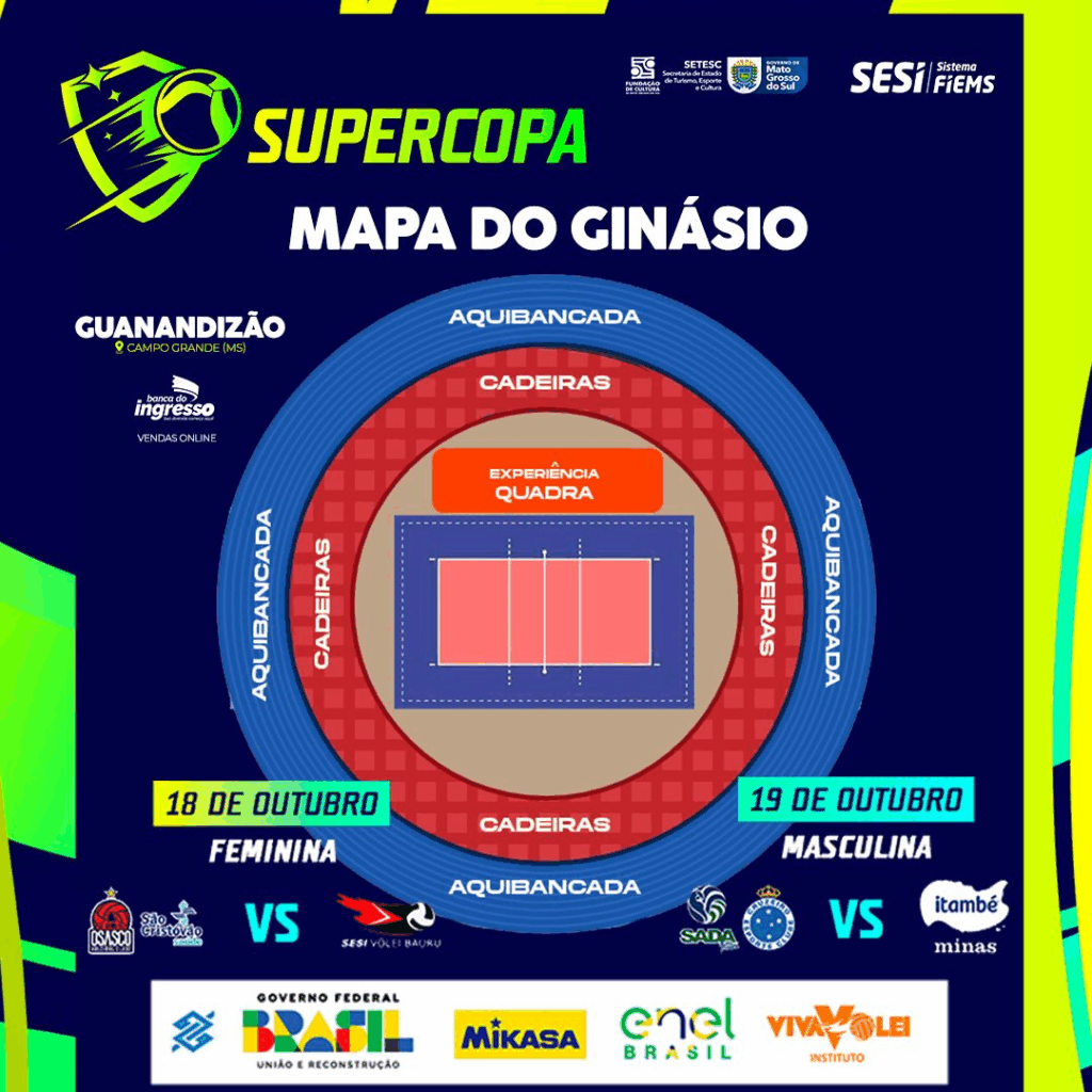 A Supercopa de Vôlei desembarca em Campo Grande nos dias 18 e 19 de outubro, no Ginásio Poliesportivo Avelino dos Reis (Guanandizão), e a venda de ingressos já está aberta. Há bilhetes a partir de R$ 40 (condições especiais para clientes Banco do Brasil) e opções premium com open food e open bar por R$ 350 na “Experiência em Quadra”, para quem quer assistir bem pertinho dos atletas.