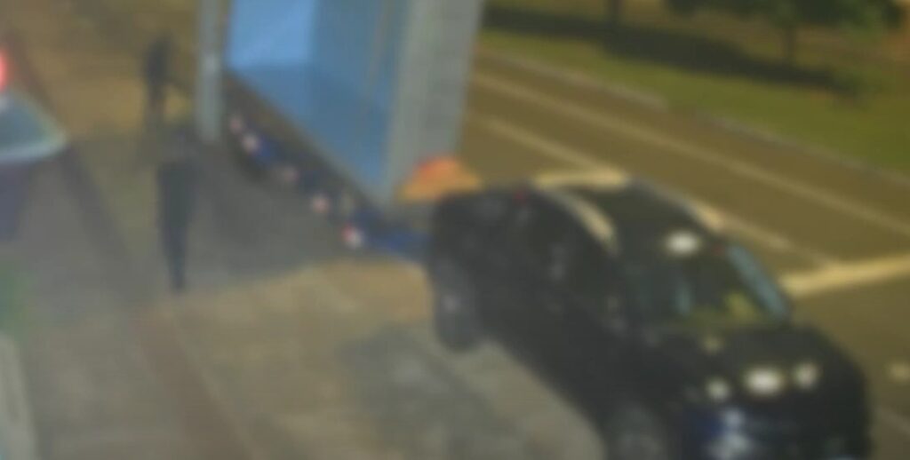 As imagens mostram um suspeito passando em frente ao estabelecimento às 2h23 da madrugada, onde há uma Fiat Toro estacionada. Nela, há uma carretinha engatada com uma piscina de 7 metros.